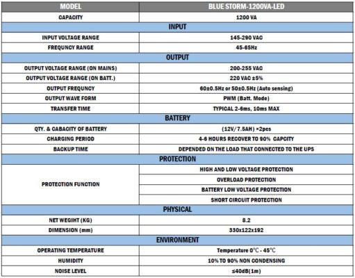 bulit in Avr (automatic voltage regulator ) 2-lead acid , maintance free battery inside ups provides strong power. (12v / 7.5 AH ) * 2pcs .Cpu controlled. silnce function. Auto restart when ac recover. Fixed output voltage (220 vac ±5%). Automatic charging (offline charging).Self-testing while switching on overload & short circuit protection.