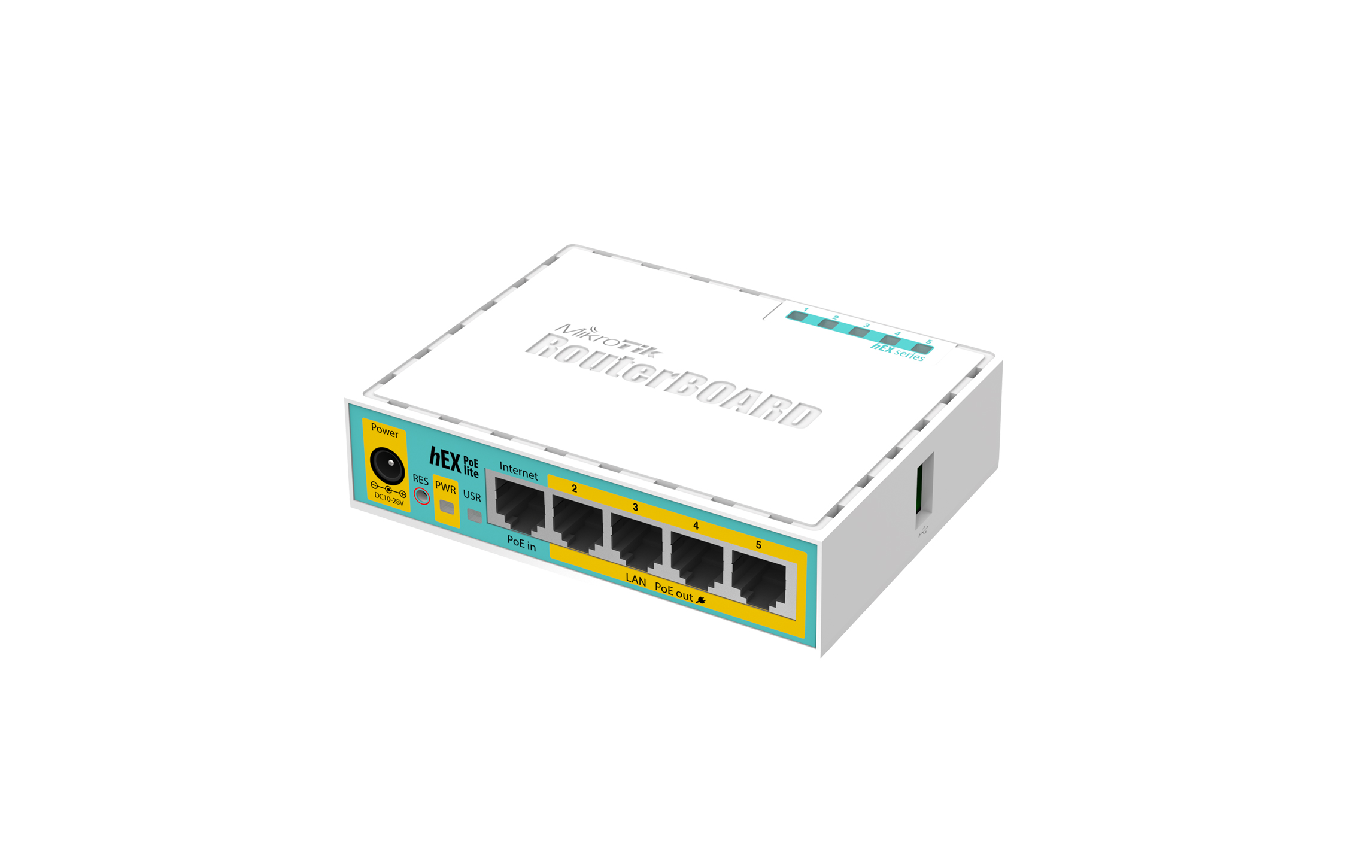 جهاز hEX PoE lite هو راوتر إيثرنت صغير يحتوي على خمسة منافذ ومصمم في غلاف بلاستيكي. يتضمن منفذ USB 2.0 ومخرج PoE. يمكن للمنافذ من 2 إلى 5 تزويد الأجهزة الداعمة لتقنية PoE بالطاقة بنفس الجهد المطبق على الجهاز، مما يقلل الحاجة إلى محولات وكابلات طاقة متعددة. يدعم كل منفذ تيارًا أقصى يبلغ 1 أمبير. جميع منافذ الإيثرنت مزودة بحماية درع لتعزيز الأداء.