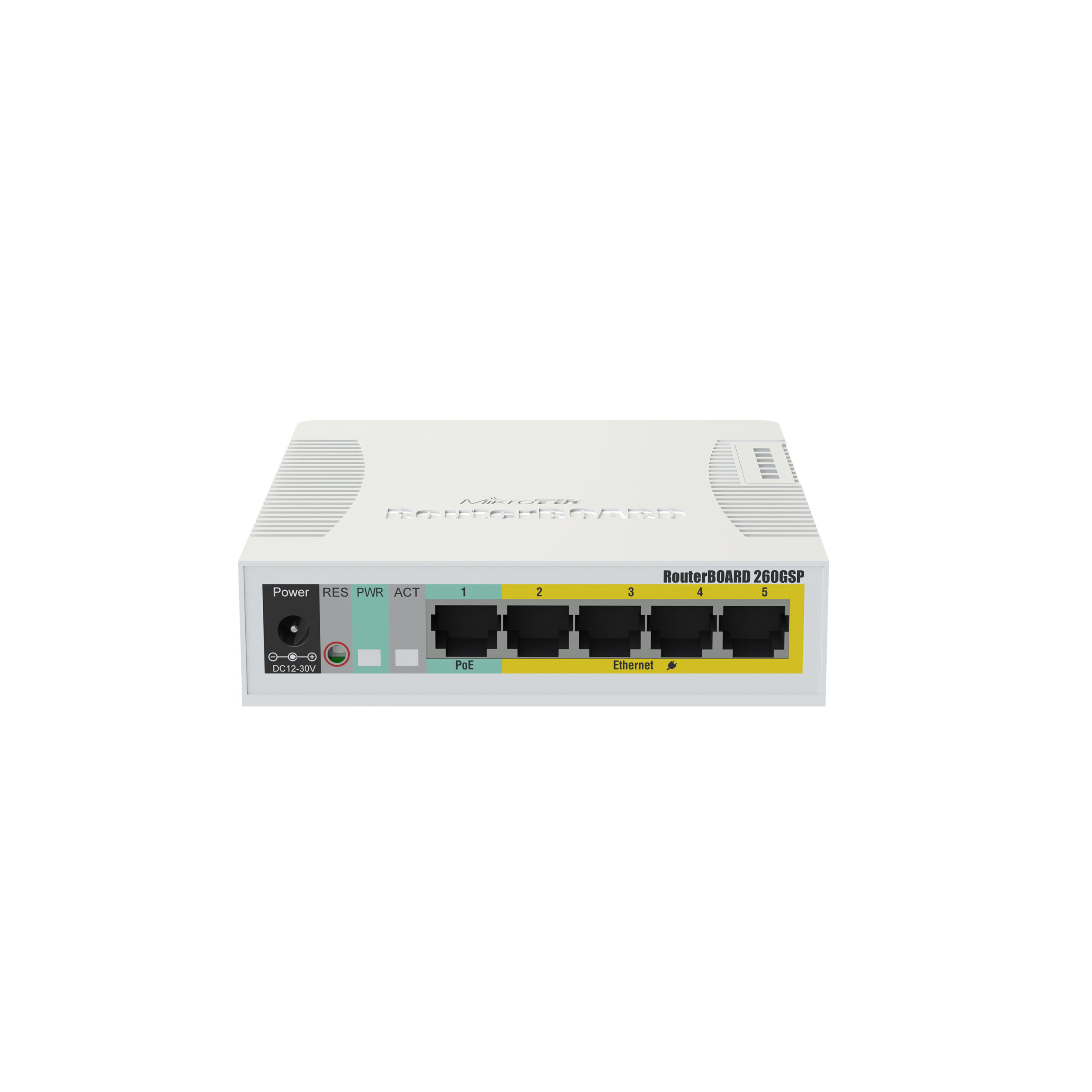 The RB260GSP is a compact SOHO switch featuring power output on its Ethernet ports. Ports 2-5 can supply power to other PoE-capable devices using the same voltage applied to the unit (passive PoE over data lines only).